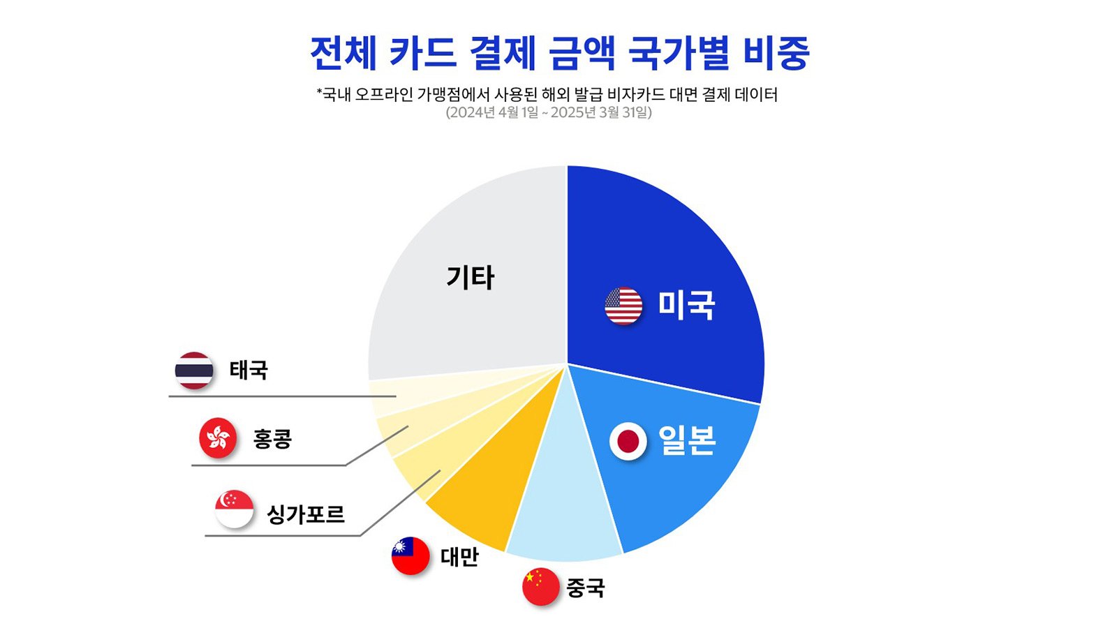 방한 외래 관광객의 전체 카드 결제 금액 중 가장 큰 비중을 차지한 상위 7개 국가 및 지역은 미국, 일본, 중국, 대만, 싱가포르, 홍콩, 태국 순이었다. 미국, 일본, 중국 3개국은 전년 동기와 동일한 순위를 유지하며 전체 결제 금액의 절반 이상을 차지해 여전히 한국 관광 시장의 핵심 국가로 나타났다.